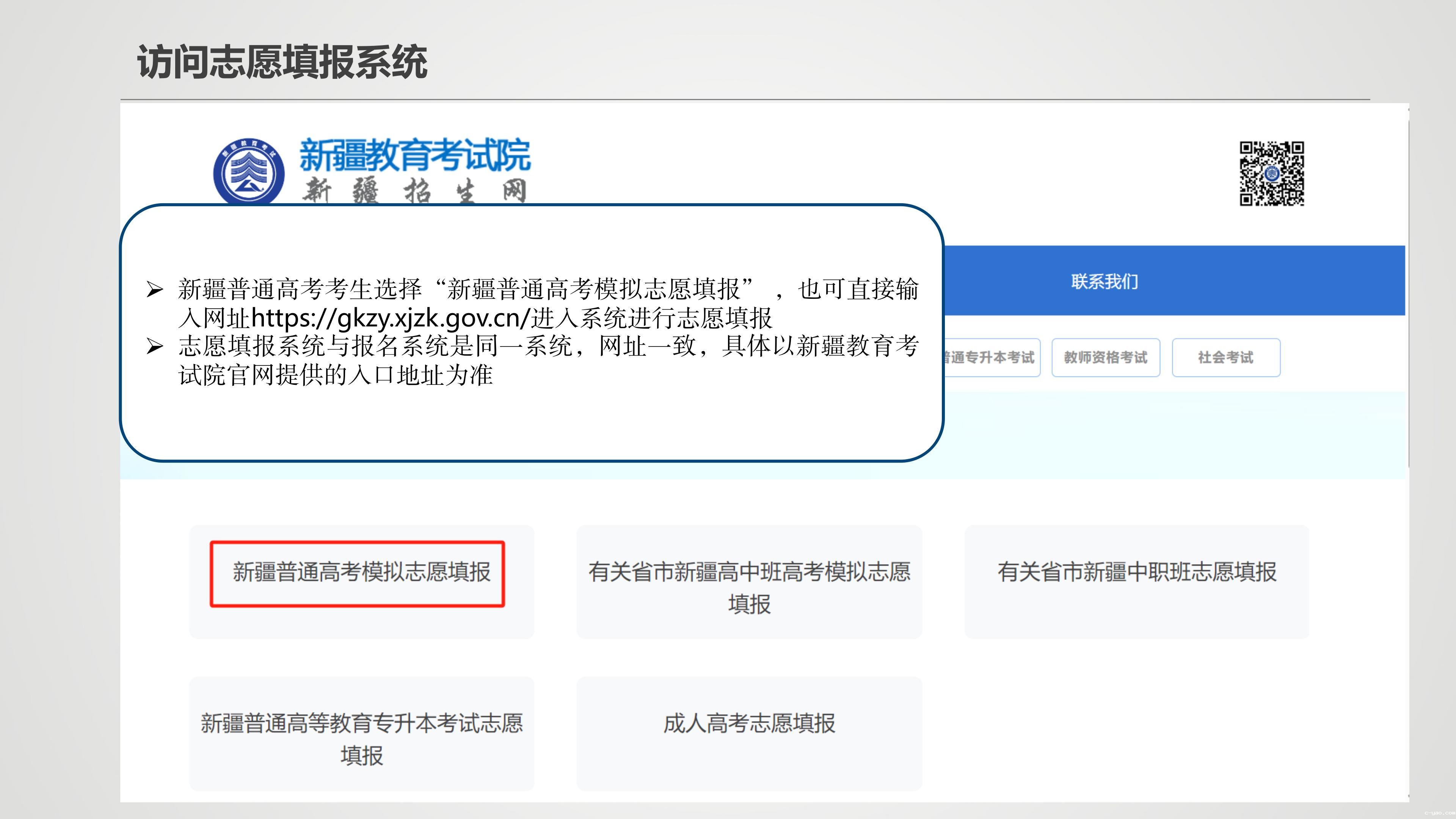 所有已完成2025年新疆普通高考报名的考生均可登录新疆教育考试院官网(//www.c-yao.com),在页面下方“公众服务大厅”栏点击“志愿填报”,选择“新疆普通高考模拟志愿填报”,也可直接输入网址https://gkzy.xjzk.gov.cn/student_anon/login进入系统进行模拟填报。(志愿填报系统操作方式详见附件)。